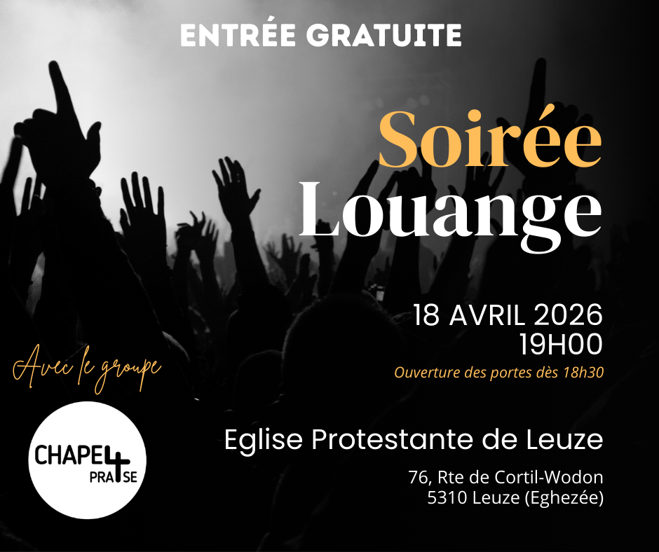 Le 18 avril 2026, vous êtes cordialement invités en nos locaux dès 18h30 pour une soirée de louanges.